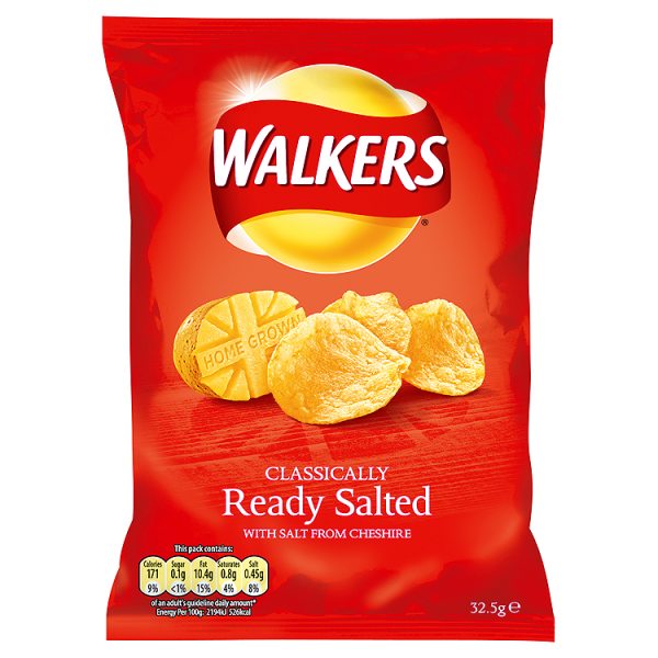 With salt from Cheshire. 100% great British potatoes. Cooked with sunseed oil, naturally lower in saturates. No MSG. No artificial colours or preservatives. Suitable for vegetarians. Ready salted potato crisps Cooked with Sunseed Oil, naturally lower in saturates** **Over 75% lower in saturates than traditional cooking oils At Walkers we believe Home Grown food tastes best That's why as well as using the best British potatoes we've now searched every corner of Britain for the tastiest home grown British ingredients to go into all of our irresistible flavours... CO2 Reducing with the Carbon Trust We have committed to reduce the carbon footprint of this product carbon-label.com Find us at facebook.com/walkers